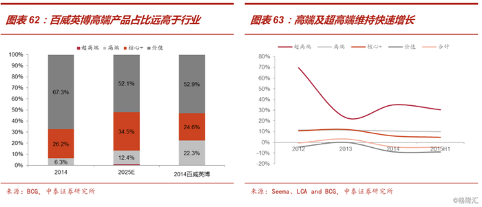 百威英博定位高端,迎合中国消费升级趋势。根据BCG,2014年中国啤酒市场里超高端、高端、核心+、价值型分别占0.2%、6.3%、26.2%、67.3%,预计2025年结构占比将升级为1%、12.4%、34.5%、52.1%。由于百威英博旗下高端品牌百威在中国的流行,2014年其产品结构明显优于行业,超高端、高端、核心+、价值分别占0.2%、22.3%、24.6%、52.9%。2012年开始,行业整体销量呈持平下滑趋势,价值型啤酒下滑最多,核心+增速放缓,高端和超高端仍保持较快增长。