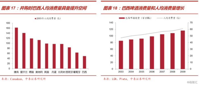 巴西是全球前五大啤酒消费国,消费量保持较快增长。2003年巴西啤酒销量为856万千升,是全球第四大啤酒消费市场(消费量),仅次于中国、美国和俄罗斯。2003年巴西人均啤酒消费量接近50L,对比成熟市场有较大提升空间,且巴西作为足球王国有良好的啤酒饮用习惯。至2009年,巴西啤酒消费量增长至1161万千升,人均消费量达到61L,已超过俄罗斯成为第三大啤酒消费国。