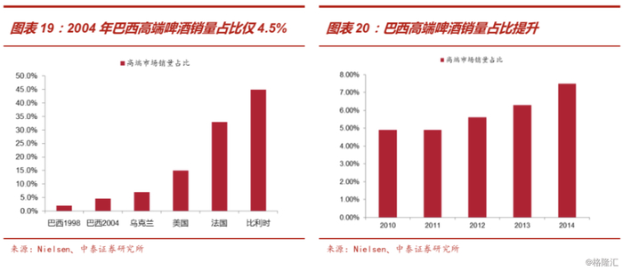 巴西高端啤酒具备广阔的增长空间,结构持续升级。2004年巴西高端啤酒销量占比为4.5%,对比1998年的2%有所提升,但跟发展中国家乌克兰及发达国家美国、法国、比利时比较仍有广阔的提升空间。巴西啤酒一直延续结构升级趋势,2014年高端占比达到7.5%。(高端指超过价格指数115%,核心指价格指数的85%-115%倍,低端指低于价格指数的85%)