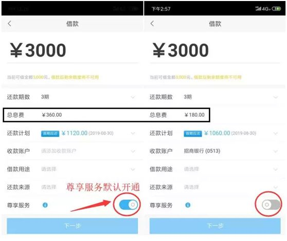 粗略算了一下,以谢先生这笔借款为例,这笔利息的综合年化费率为71%,远高于现金贷综合费率36%的国家标准。而58好借的综合费率之所以如此高,原因在于平台默认开通了“尊享服务”,如果关闭该服务,则总息费减半。