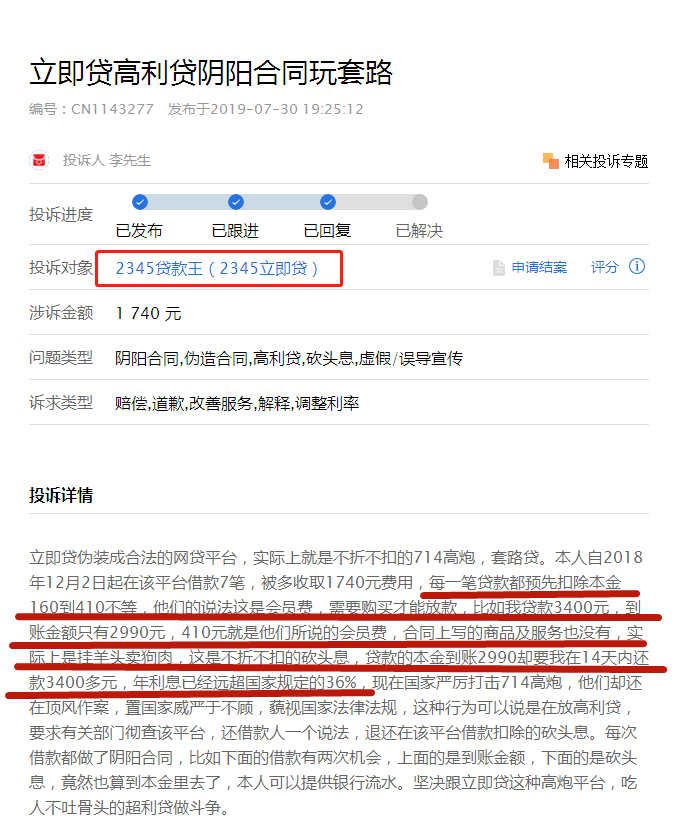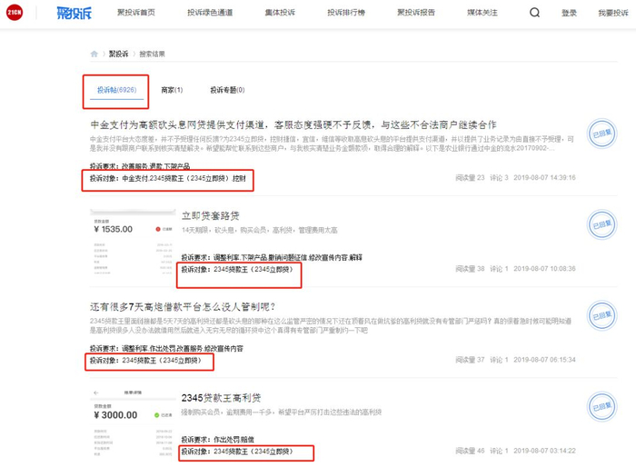 17年上半年,依靠着现金贷业务,2345的净利润达到了4.5个亿。现金贷业务的抽成有多高呢?《每日经济新闻报》曾做过一个调查:记者按2345现金贷的流程申请贷款时发现,按照借款3000元,0.06%的日利率,一天利息1.8元,以30天期限计算,到期应还3054元。这么看好像没毛病,但平台却预先扣除了186元手续费,实际到账只有2814元。然鹅,最流氓的操作还不是这里——明明只收到2814元,这个软件还要以3000的日利率算利息,要你到期还3054元。那么你实际上要还的利息,就变成了186元手续费+240元=426元。咱们设想一下:你借了2814元,一个月利息要426元(正常借贷平台的利息只要50元/月),超过一个月还得给你加利息,还跟你说这是正常收费,你干不干?只要是正常人,都不会答应,因为这明摆着就是高利贷,计算下来的实际年化利率约为104%,已经远远远远超过国家利率标准的红线36%。很多人就这样稀里糊涂的被扣了钱,等到反应过来的时候,2345的催债电话也打过来了。在聚投诉网站上,关于2345立即贷的投诉贴,高达6926条: