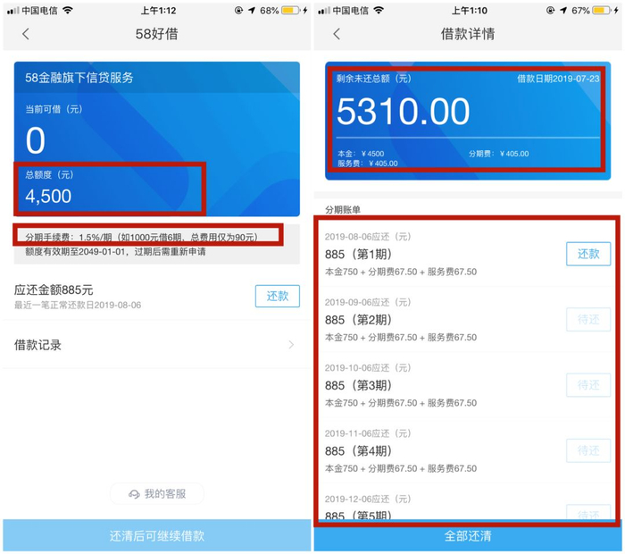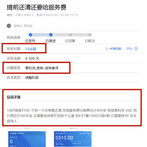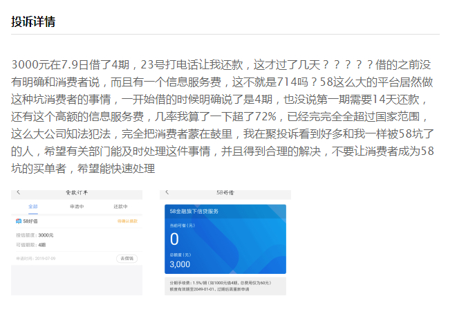这块韭菜地我们都不陌生,它就是我们熟悉的网络贷款。网络贷款看起来没什么稀奇,毕竟现在可以说是随处可见。但在58眼里,它好比风口上飞翔的猪,能宰一块肥肉是宰一块肥肉。只是58没想到,宰着宰着,它快把自己给宰倒了。 0158借钱一时爽,高额利息火葬场前几日,自媒体独角金融曝光了58同城的一宗投诉: 7月31日,邓先生在58同城旗下的金融产品“58好借”上借了4500块,不到一个月想要还清,却发现他要连本带利还给“58好借”5310元。然而,邓先生记得非常清楚——借钱的时候,58好借的宣传页面显示,1000元借款,分6期,分期手续费率1.5%/期,总手续费仅需90元。