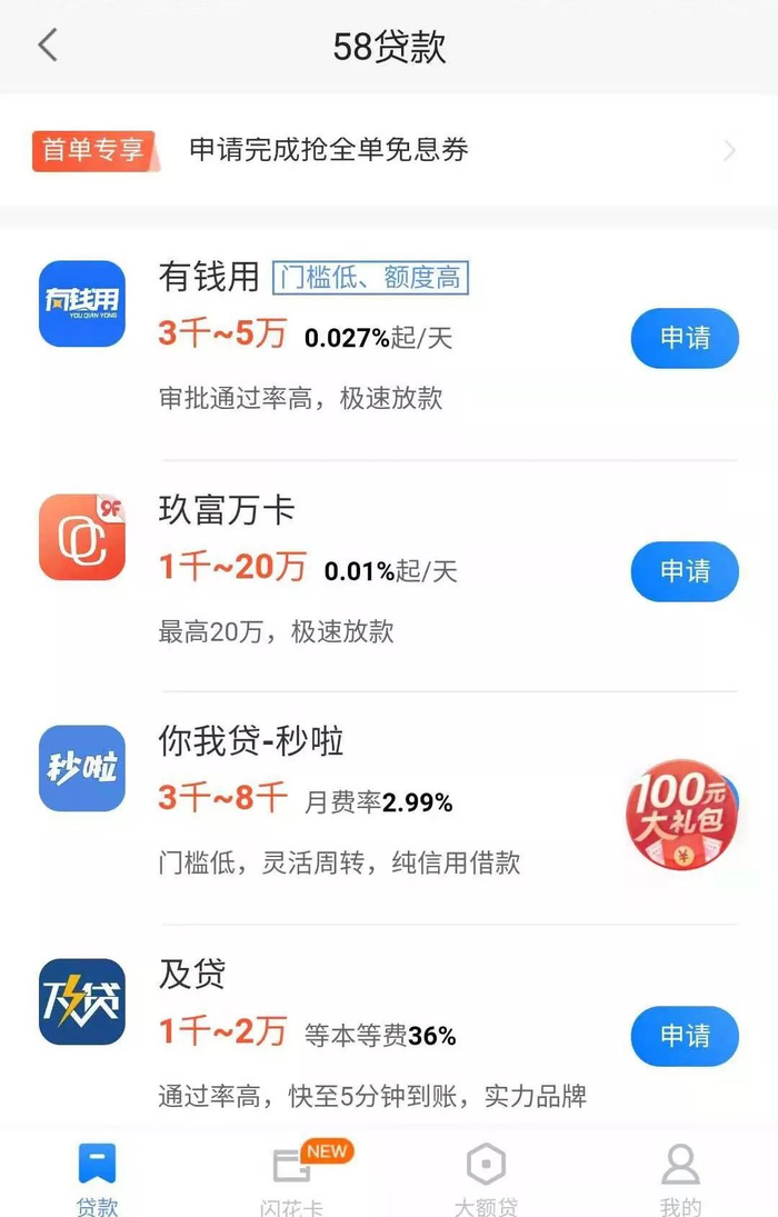 在关闭“尊享服务”情况下,总息费只有180元。据此以IRR公式计算,58好借综合年化费率刚好36%,刚好打了国家的擦边球。可以这么说,58好借这一波操作,其实就是在变相砍头息、高利贷,兼带虚假宣传和暴力催收。但人家只是狡猾的让你“默认开通尊享服务”,最后让人哑巴吃黄连,有苦说不出。但你以为这样就完了吗?并没有。因为除58好借外,58同城app内,“58贷款”超市里还有很多其他公司的贷款产品:有钱用、玖富万卡、你我贷-秒啦、掌众-闪电贷款、信用钱包、豆豆钱、小赢易贷、我来贷......