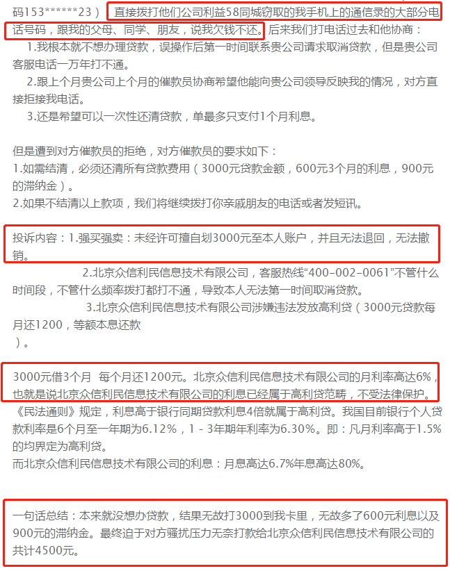 上述平台,多家是投诉网站的常客——你我贷“暴力催收、砍头息、恐吓”投诉超过10000条;玖富万卡被投诉“变相收取费用、高利贷”等8800条。信用钱包隶属量化派,投诉量高达3100多条,涉嫌高利贷、暴力催收、违规收费......说白了,这些产品本质上都是赤裸裸的高利贷。但58同城却堂而皇之的把它们都召集起来,有钱大家一起赚,有韭菜大家一起割,这波不亏。有人只想查查有多少借贷额度,结果银行卡莫名其妙多了一笔钱,被强制放贷。身边的亲朋好友被催债公司疯狂骚扰,导致受害人不仅名声受损,投诉无门,还要忍受来自催债人员的辱骂,并被迫偿还本不该偿还的贷款:
