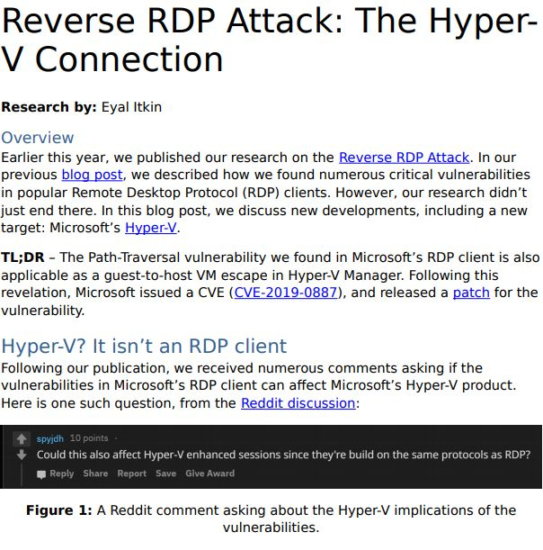 参考木桶原理,一套系统的安全性,取决于防护措施最不到位的那一环。换言之,通过依赖其它软件库,Hyper-V 管理器可以继承 RDP 中任何其它软件库中的所有安全漏洞。