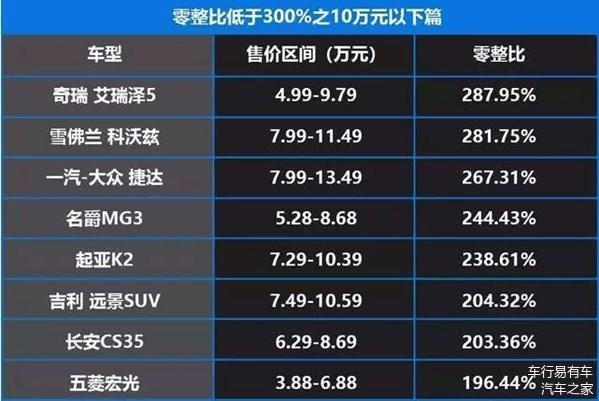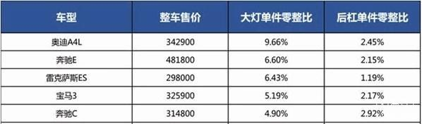 说到养车,扣除保险、保养等费用不说,车辆在我们使用途中,还是会有可能发生意外而导致车辆损坏的,车辆损坏就得维修,那么配件的费用就决定了这台车的维修费用。说到维修费用和配置费用,业内用车辆"零整比"来表示。