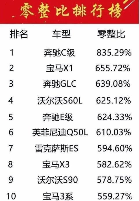 在最新零整比排行榜中,奔驰和宝马成为了最受关注的焦点,两品牌各占三席。其中奔驰C级更以835.29%夺得榜单中的第一,奔驰GLC零整比为639.08%,位列第三,而奔驰E级零整比达到了624.33%,夺得第五。