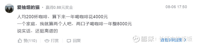 这是点赞第二高的观点,这位@爱抽烟的猫的球友提出了,两口子喝咖啡一年整8000元,说实话,还挺离谱的观点。