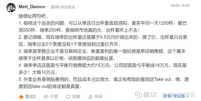 获得高赞第三名的是@Matt_Damon ,主要说了瑞幸单店出杯量上不去,量价无法齐升,无法实现盈利,外卖倒贴费用这几个问题。短短数行,针针见血。