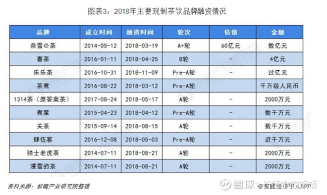 2018年不仅是现制茶饮疯狂开店的一年,也是新茶饮疯狂融资的一年。在一二级市场资金紧张的背景下,现制奶茶几家明星品牌全年融资仍然超过了10亿元,奈雪の茶更是以A+轮60亿估值成为我国现制茶饮行业的第一个独角兽企业,喜茶单轮融资额达到4亿元,众多成立于2014-2016年的现制茶饮品牌在2018年也迎来了集中融资风暴。同时这种趋势也延续到了2019,就在今天腾讯宣布入局喜茶,这不仅给中国的现制茶饮打了一针兴奋剂,也是对瑞幸等连锁咖啡店的一种无形的冲击。