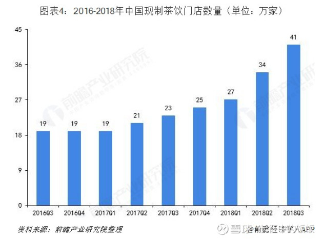 截止到2018年第三季度末,全国现制茶饮门店数量达到了41万家,一年之内增长了74%,扩张速度非常快。新增长主要来自消费者对常规饮料的替代和消费群体对“健康茶饮”的需求。