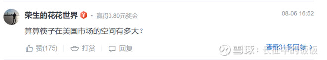 其中最高赞的评论是这位叫做@荣生的花花世界的球友,提出了算算筷子在美国市场的空间有多大,我也是算被怼的心服口服。想想也对,芝士、红酒在中国市场的消费份额和茅台、五粮液在美国欧洲市场的消费份额应该都是很难提高的,很多时候饮食习惯的养成是一个长时间积累的过程。所以对于对标其他地区和城市,推测出按照年人均200杯的天花板来计算,目前1000亿市场份额的中国咖啡市场份额有望达到32000亿,还有30倍空间。这个结论有失偏颇,对于整个市场的天花板,基于文化和饮食习惯的不同应该会大打折扣。