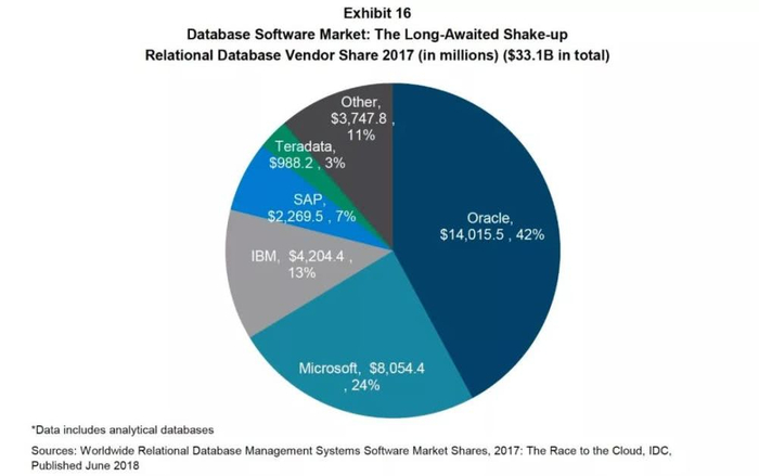 Oracle营收份额42%仍居第一,随后排名依次为微软、IBM、SAP和Teradata。(请注意,这里的关系型数据库统计又包含了分析型产品。)