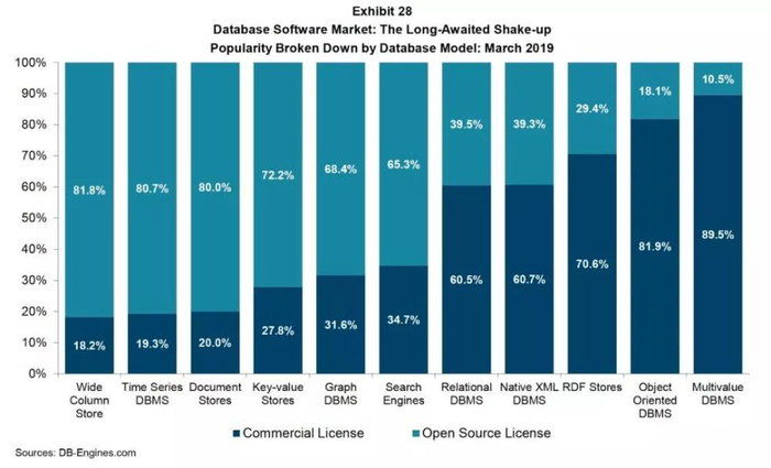 商业产品在关系型数据库的占比仍然高达60.5%,而上表中从这列往左的分类都是开源占优: