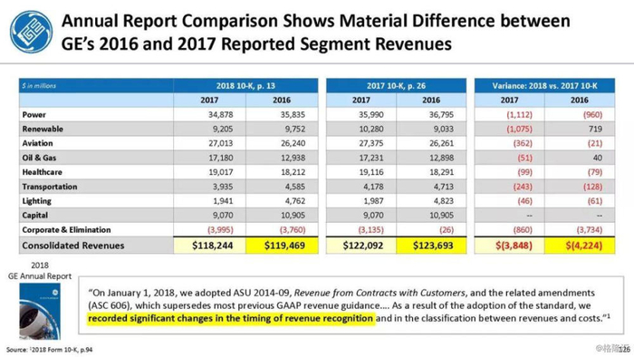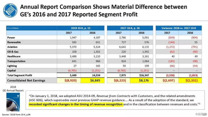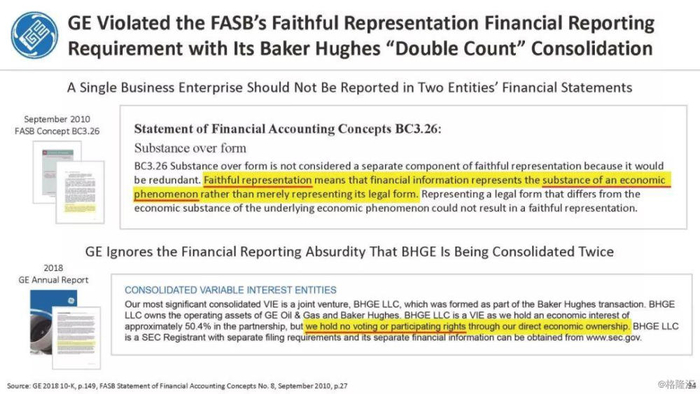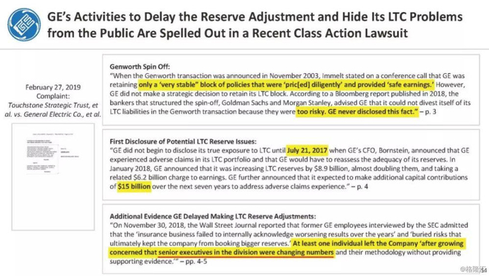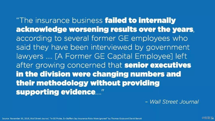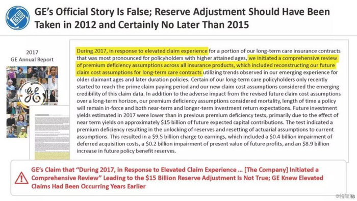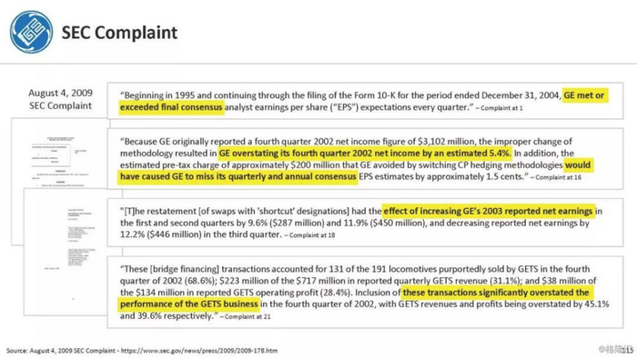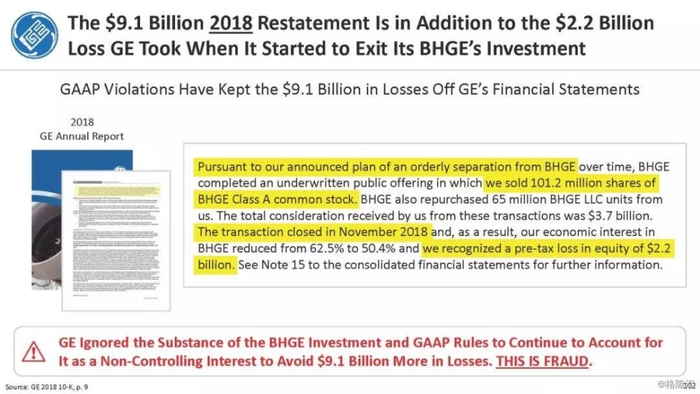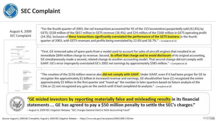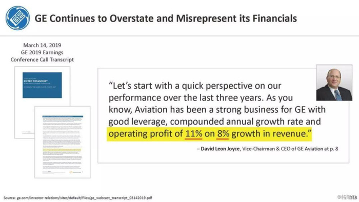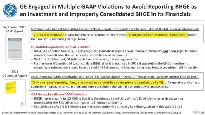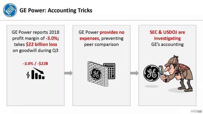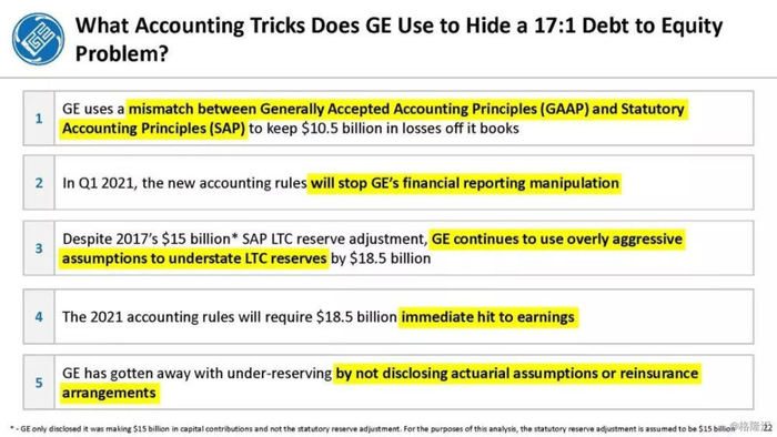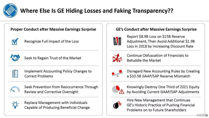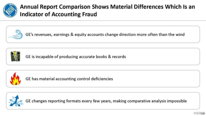报告直指通用电气企图通过不准确的、甚至是欺诈的财务报表来掩盖公司财务和经营问题,与2001年的安然丑闻有过之而无不及。报告列举了几宗罪: