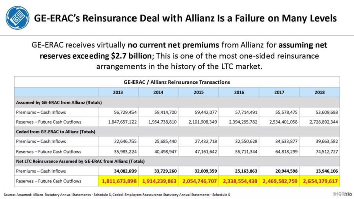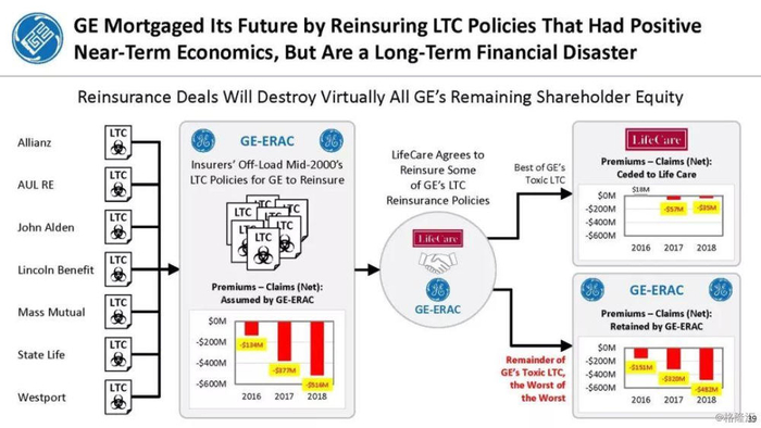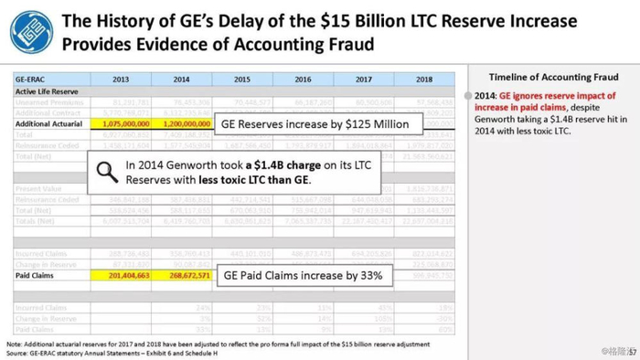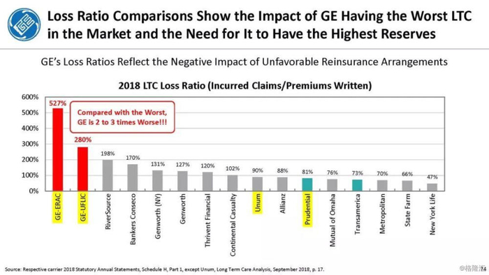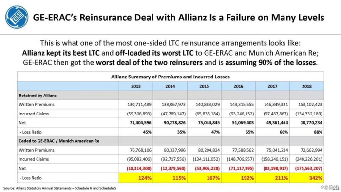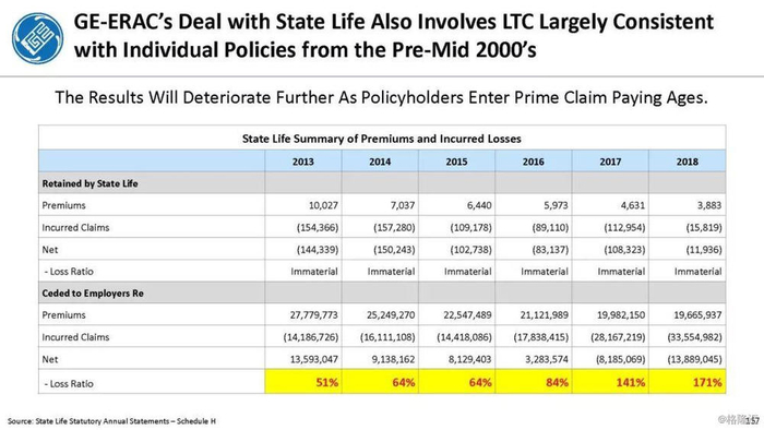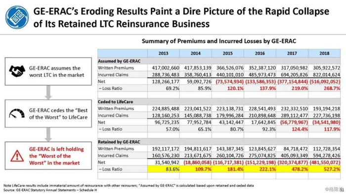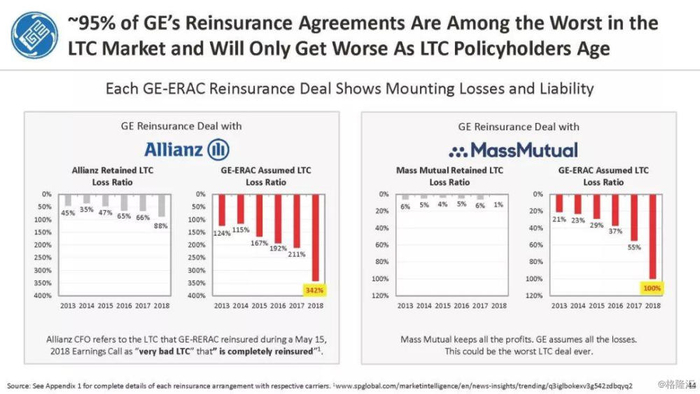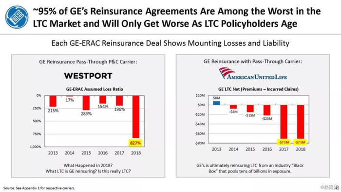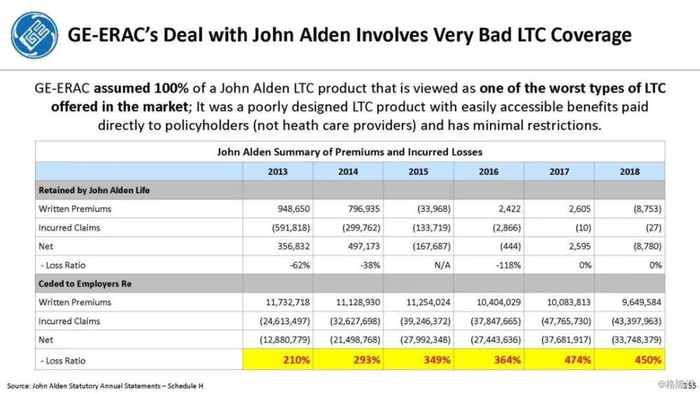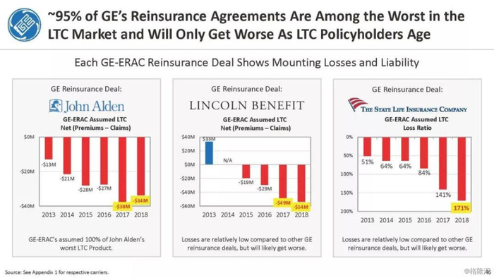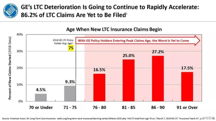 我们付费使用全国保险专员协会(NAIC)和AM Best数据库访问这8家保险公司向相关国家保险委员会提交的法定财务报表,他们揭示的信息是,通用电气隐瞒了巨额损失率,这是LTC保险业有史以来最高的损失率,同时通用电气吸收了成倍增长的美元损失。损失最大的GE金融保险部门是ERAC,该部门的平均投保人年龄现在为75岁。该部门的亏损导致通用电气在2017年末/2018年初意外触及150亿美元的准备金。不幸的是,年龄在76-80岁之间的5岁人群中,LTC索赔额将增长77%,这将使通用电气的损失增加几倍。我们预计通用电气的一些再保险协议很快会出现750%至1000%或更高的损失率。根据行业数据,通用电气约86%的长期资本索赔先于这些索赔,随之而来的损失正以指数级和不可生存的速度增长。