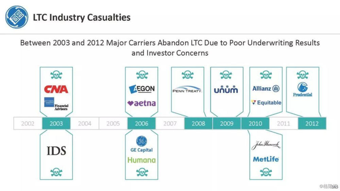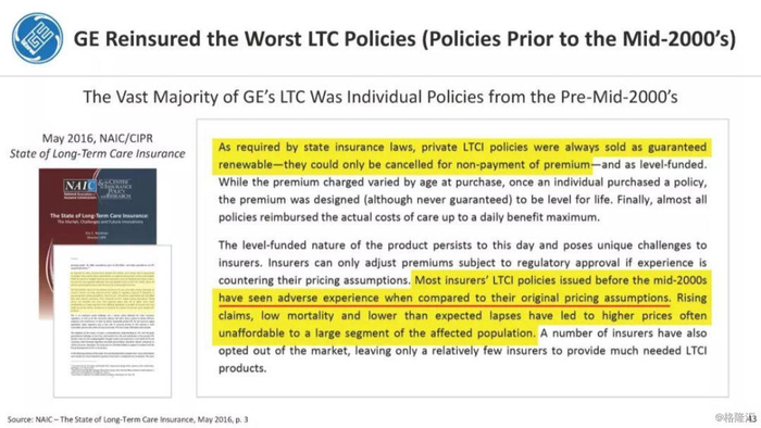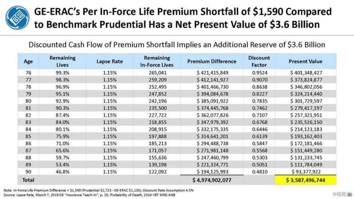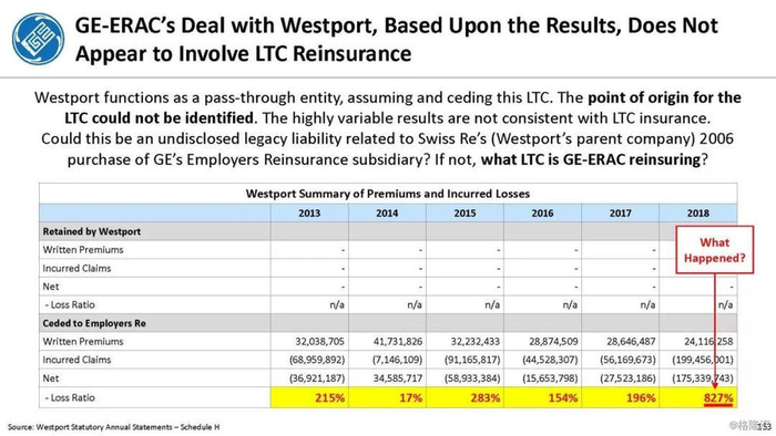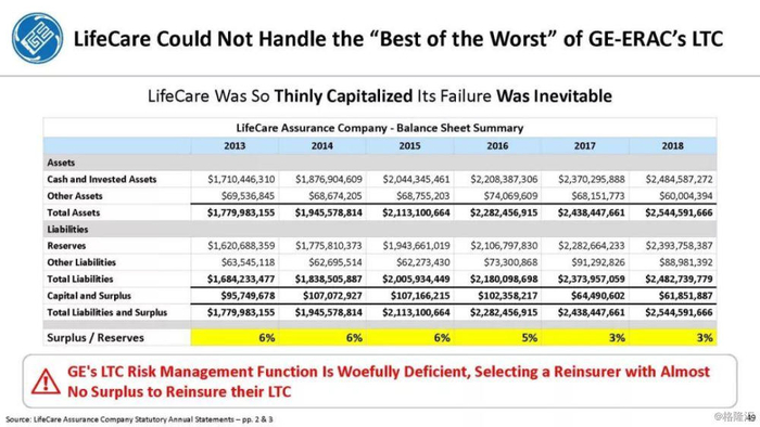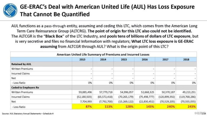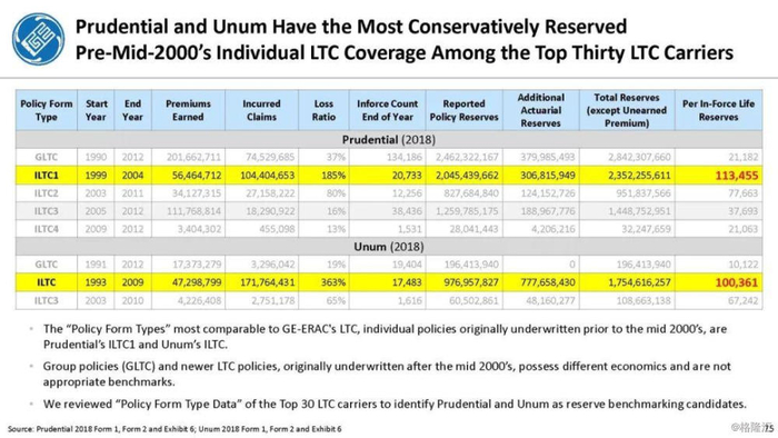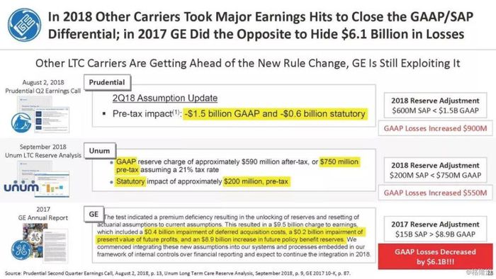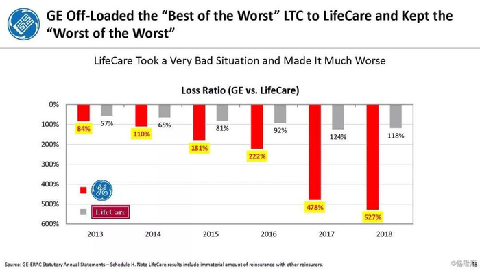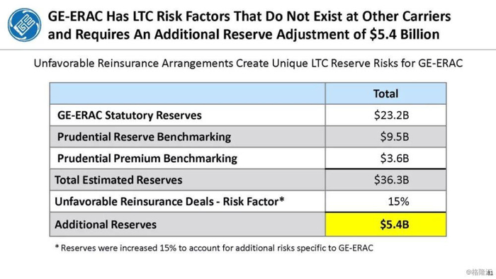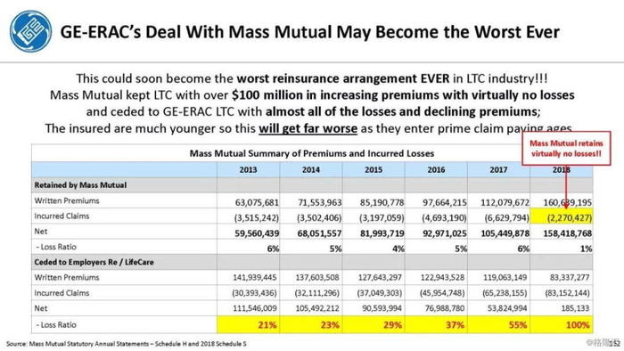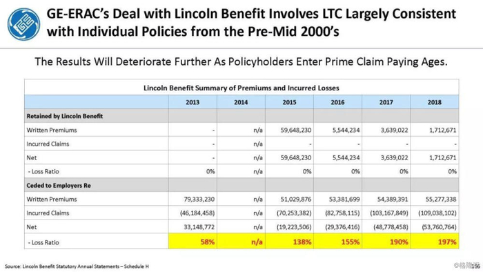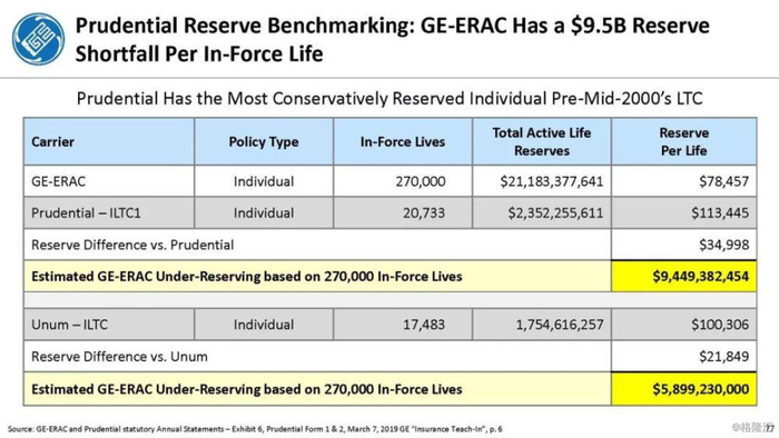 我们付费使用全国保险专员协会(NAIC)和AM Best数据库访问这8家保险公司向相关国家保险委员会提交的法定财务报表,他们揭示的信息是,通用电气隐瞒了巨额损失率,这是LTC保险业有史以来最高的损失率,同时通用电气吸收了成倍增长的美元损失。损失最大的GE金融保险部门是ERAC,该部门的平均投保人年龄现在为75岁。该部门的亏损导致通用电气在2017年末/2018年初意外触及150亿美元的准备金。不幸的是,年龄在76-80岁之间的5岁人群中,LTC索赔额将增长77%,这将使通用电气的损失增加几倍。我们预计通用电气的一些再保险协议很快会出现750%至1000%或更高的损失率。根据行业数据,通用电气约86%的长期资本索赔先于这些索赔,随之而来的损失正以指数级和不可生存的速度增长。