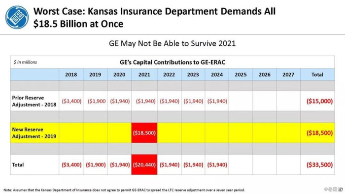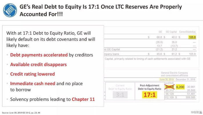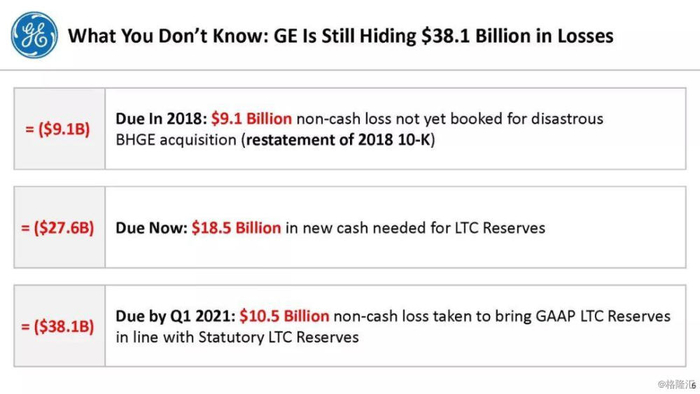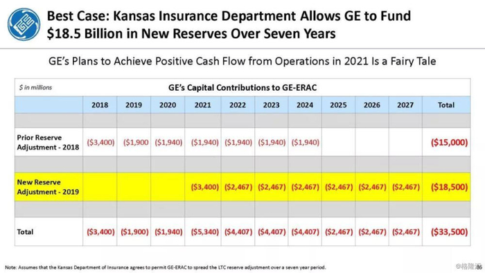 通用电气需要290亿美元的新长期资本储备,其中185亿美元需要立即需要现金,其余105亿美元是非现金GAAP费用,会计准则要求不迟于2021年1季度支付。这些即将到来的损失将破坏通用电气的资产负债表、债务比率,并可能违反债务契约。不幸的是,通用电气几乎没有现金,因此他们不得不要求堪萨斯保险部(KID)给予特别的宽容,以便在7年的时间范围内为其2018年1月增加的150亿美元准备金提供资金,因此他们能够为新的现金准备金提供185亿美元资金的可能性是值得怀疑的。更值得怀疑的是,通用电气的管理层表示通用电气在2021年的现金流将实现正增长。