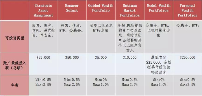 LPL Financial六种不同的账户类型【可投资类型是指不同账户,可以投资的金融产品;账户最低投入额为账户类型中,最低要存入的资金;年费是指账户一年需要上缴的费用(不包含administrative fee,另类资产投资费,交易费等)】: