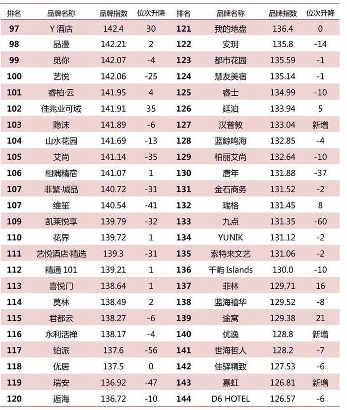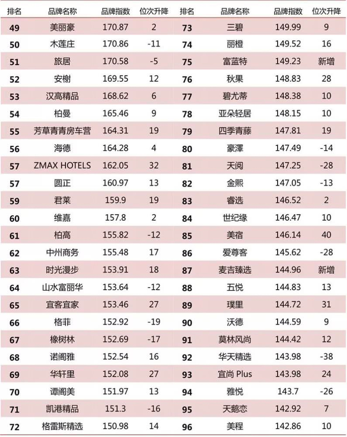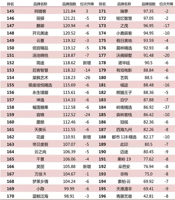 榜单内共计61家全服务中档酒店品牌和196家有限服务中档酒店品牌。品牌影响力上,34.24%的品牌较上月环比上涨;分别来看,24.59%的全服务中档酒店品牌环比上涨,37.24%的有限服务中档酒店品牌环比上涨。品牌排名上,33.07%的品牌环比上升;分别来看,29.51%的全服务中档酒店品牌环比上升,34.18%的有限服务中档酒店品牌环比上升。具体榜单如下: