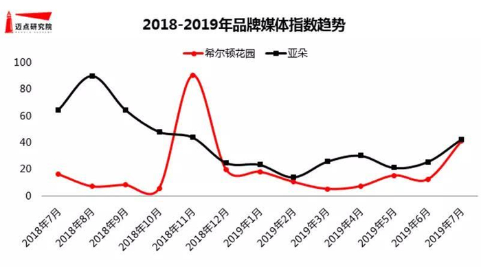 从被选取的两个中档酒店品牌媒体指数变化趋势来看,希尔顿花园与亚朵均呈现较强幅度波动。希尔顿花园是希尔顿酒店集团旗下全服务中档酒店品牌,主要针对商务出行需求打造。2019年希尔顿迎来100年华诞,迈入百年企业行列,作为国际最具知名度的酒店管理公司之一,拥有十七大酒店品牌,在全球113个国家和地区直接管理、特许经营、持有以及租赁超过5,700家酒店,逾923,000间客房。集团百年庆典相关信息明显提升了旗下品牌的曝光度,本月希尔顿花园主动传播具体内容包括优惠活动、开业信息等,整体上增加了品牌的关注度。