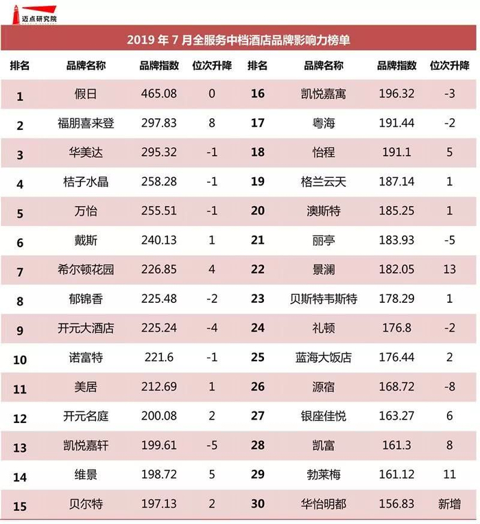 本月迈点研究院最新独家发布的“2019年7月中国住宿业全服务中档/有限服务中档酒店品牌影响力榜单”中,假日、福朋喜来登、华美达、桔子水晶、万怡、戴斯、希尔顿花园、郁锦香、开元大酒店和诺富特等成为全服务中档酒店品牌TOP10;有限服务中档酒店品牌前十名则分别是维也纳、全季、丽枫、亚朵、锦江都城、智选假日、白玉兰、希尔顿欢朋、美豪与和颐。