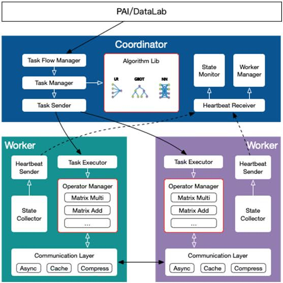 用户在建模平台构建好的训练任务流会下发给 Coordinator 的 Task Flow Manager,Task Flow Manager 会把任务进行拆解,通过 Task Manager 把具体算法下发给 Worker 端的 Task Executor,Task Executor 根据算法图调用 Worker 上的安全算子完成实际的运算。