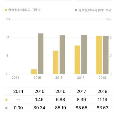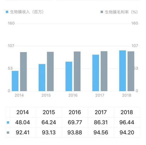 矣!看到公司的主打产品销量节节攀升,毛利率都在90%以上,不由得为之惊叹,好一个闷声发大财的公司!至于在招股说明书中披露的皮肤修复膜,在18年的年报中已经看不到踪影了,我们只能判断被踢出了市场。