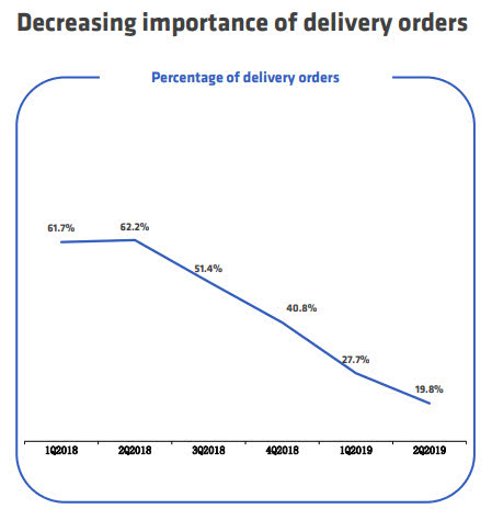 与之对应的是,外卖所占比例,已从去年二季度的 62.2%下降到2019年二季度的19.8%。
