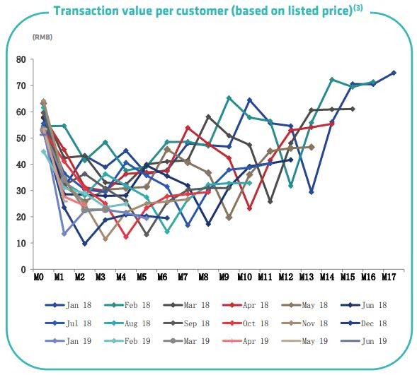 2019年第二季度,瑞幸咖啡平均月活用户为620万,月平均销售量2760万(件)。平均下来,每个活跃用户消费4.45件商品/月。相比于去年同期3.3件商品/月的人均消费量,增长了35%。