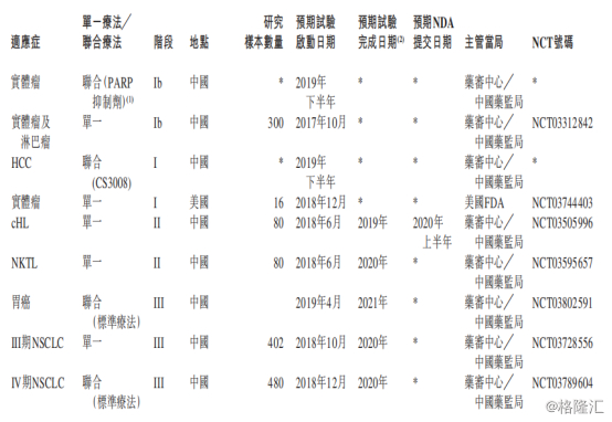为了进一步挖掘CS1001的市场潜力,除了上述临床试验外,基石药业还计划针对CS1001联合疗法开展临床试验,其中2019年6月已获批在中国启动一项有关CS1001联合fisogatinib (CS3008)用于局部晚期或转移性HCC患者的临床试验。此外,基石药业已经将未来一年有关联合疗法的进程列上日程:(i)2019年下半年及2020年上半年进行CS1001联合瑞戈非尼用于多种适应症的Ib期试验;(ii)2019年下半年在中国进行CS1001与fisogatinib (CS3008)联合用于治疗HCC患者的I期试验;及(iii)2019年下半年在亚太进行CS1001与PARP抑制剂联合用于治疗实体瘤患者的Ib期试验。