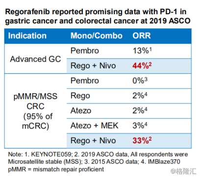 采用肿瘤免疫联合疗法,使得药物的治疗适应症范围更广,作用效果更佳,这也是基石药业使用联合疗法的优势所在。在2019年ASCO上,拜耳公司公布了其抗癌药物瑞戈非尼联合施贵宝PD-1药物用于晚期胃癌和结直肠癌的喜人数据。图表三中显示,在治疗胃癌时,单一抑制剂Pembro的客观缓解率(ORR)仅为13%,而使用两种抑制剂Regorafenib与Nivo可以达到44%的客观缓解率,大大提高了药物的使用效果。而在pMMR或MSS表型结直肠癌的适应症上,2019年ASCO更新了两种抑制剂Regorafenib与Nivo联合治疗的效果,客观缓解率为33%,远高于Regorafenib单一的客观缓释率2%。
