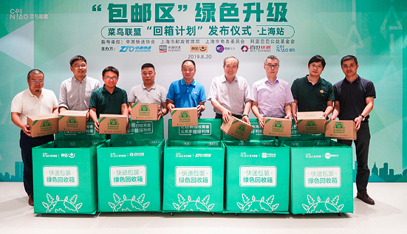 2019年8月20日,菜鸟网络联手中通、圆通、申通、韵达、百世等五大快递公司,在上海正式发布了一项旨在促进快递包装分类回收、循环利用再次寄件的“回箱计划”。首批1000个快递回收箱已经在上海地区的上述五大快递公司末端站点进行铺设,助力上海实现绿色回收全覆盖。