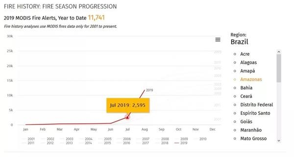 事实上,亚马逊地区每年火灾都有数万起。根据巴西国家空间研究所(INPE)公布的数据,截至8月22日,今年以来巴西境内的森林着火点高达75336处,平均每月将近一万起火灾,其中逾半数着火点位于亚马逊雨林。而NASA搭建的传感器MODIS数据也显示,光是2019年8月至今,已有近一万起火灾事故。