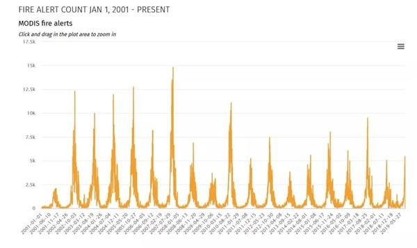 可以看出,今年的火灾烧毁面积目前还基本处于与往年持平的状态。