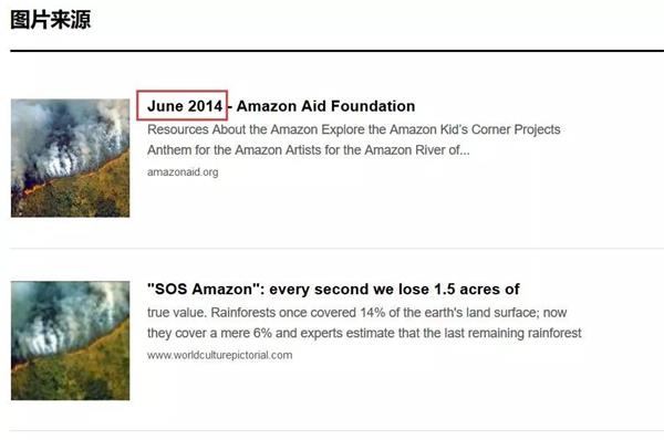 只要简单查一下图片识别,就可以发现这张图确实是亚马逊雨林的火灾照片,但至少在2014年6月以前就已经在网络上出现了: