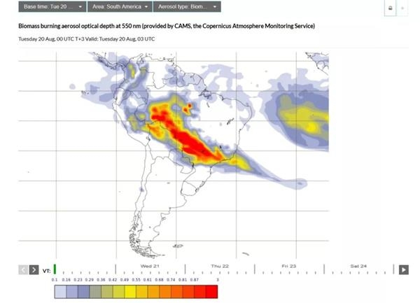欧盟也放出了该地区8月20日的生物质燃烧气溶胶图像: