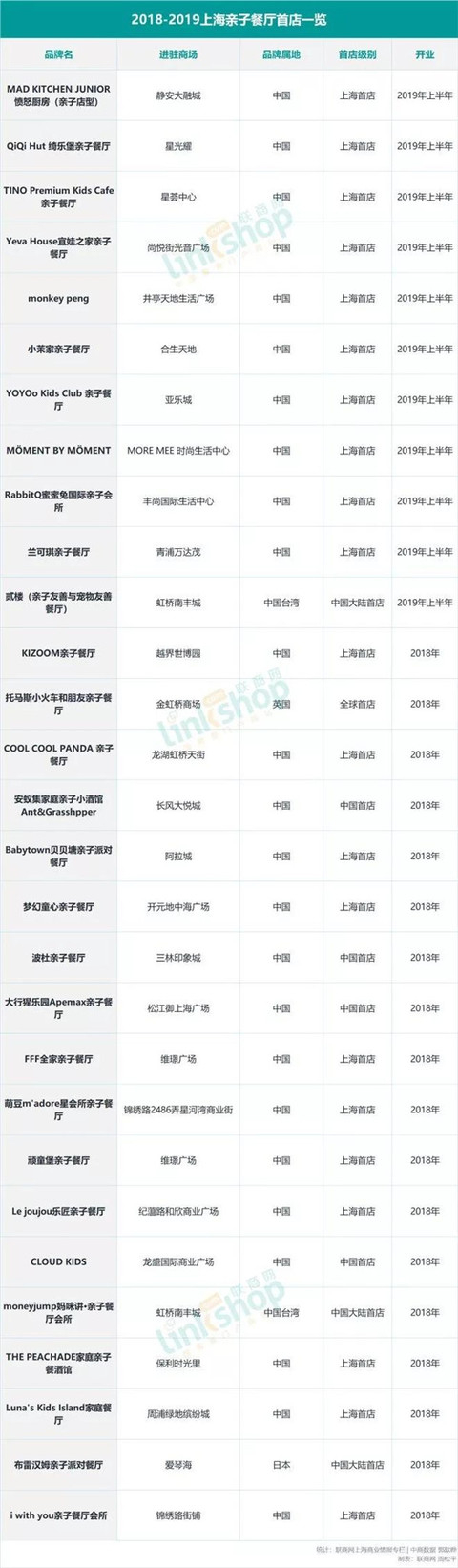 联商网上海商业情报专栏&中商数据以上海为城市样本,观察了2018-2019年亲子餐厅首店在上海各大购物中心的拓展情况,统计结果如下:
