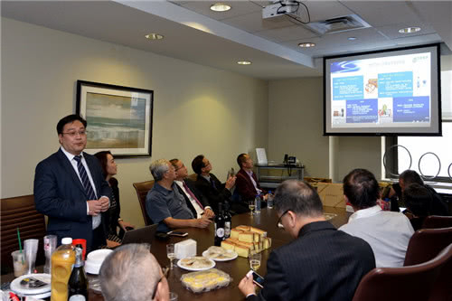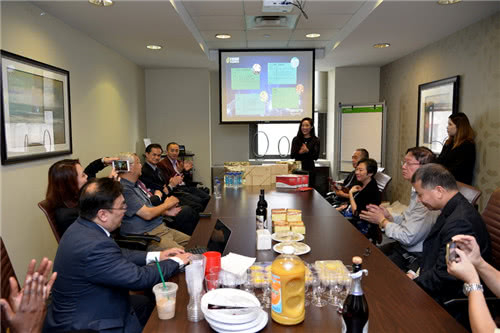 美国贝富集团行政总裁(CEO)雷迅(左1)在签约仪式上介绍利用区块链技术为產品进行防偽监管认证的核心技术。