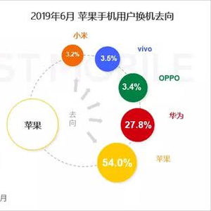 数据显示,在忠诚度上 “果粉”的忠诚度有所下降,在2018年6月到2019年6月间,ios换至ios用户由56.8%降至54%;更多ios系统用户转向安卓系统,其中,ios转向华为的用户为27.8%;ios转向vivo的用户为3.5%;ios转向OPPO的用户为3.4%;ios转向小米的用户为3.2%。
