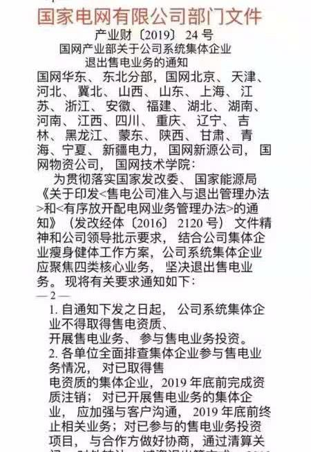 通知要求自下发之日起,公司系统集体企业不得取得售电资质、开展售电业务、参与售电业务投资。各单位全面排查集体企业参与售电业务情况,对已取得售电资质的集体企业,2019年底前完成资质注销;对已开展售电业务的集体企业,应加强与客户沟通,2019年底前终止相关业务;对已参与的的售电业务投资项目,与合作方做好协商,通过清算关闭,对外转让,减资退出等方式。