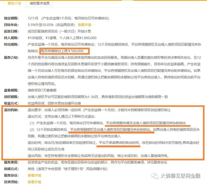 从产品的服务介绍来看,计划类产品退出机制中明确注明,“平台将根据申请及出借人借款项目匹配情况来协助转出”、“平台不承诺具体的转出时间”,“存在持有债权未全部转让完成将无法退出的风险”。在网贷P2P领域,活期和类活期的产品的风险主要来自资金池和期限错配,这类产品虽然能够吸引资金,但流动性风险高,监管也是禁止网贷平台有活期和类活期产品,禁止期限错配。
