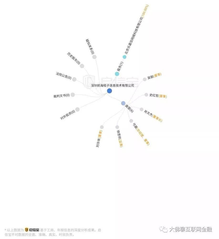 平台运营主体公司为深圳前海桔子信息技术有限公司,法人代表肖文杰,公司是北京乐嘉信网络科技有限公司的全资子公司。北京乐嘉信的股东有两位分别是肖文杰和刘强东,其中肖文杰是法人和实控人,占股比例为99.87%,刘强东我们都认识,更多是象征性入股,更多的是起到一定的增信作用。