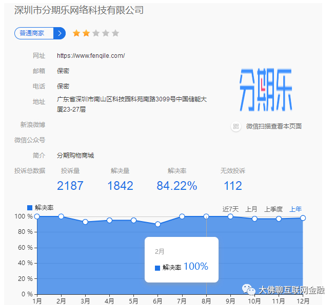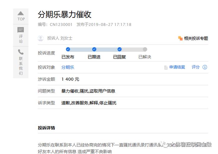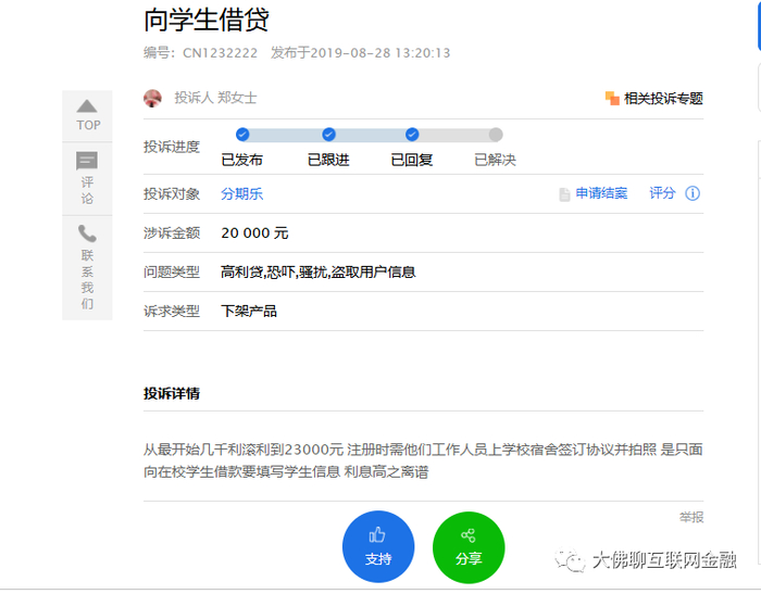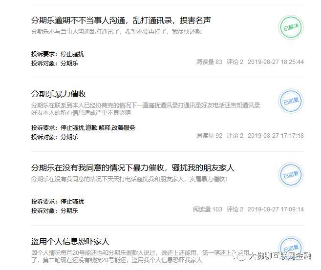 平台的资产均来自来于和平台有关联的分期乐,而分期乐主要是面向年轻人提供分期消费的金融服务平台,分期乐与京东商城及众多合作伙伴合作,最早从分期购买手机切入,逐步拓展到整个3C数码、运动户外、教育培训、吃喝玩乐等多个消费场景,从中不难看去它的资产主要就是分期贷和现金贷。需要注意的一个是在今年5月的时候,新华社曾发过一篇文章《禁令之下,校园贷“披马甲”依然横行!》,揭露了一些网贷机构披上创业贷、毕业贷、培训贷、求职贷等外衣向大学生放贷。分期乐就被当做了其中的一个案例,被点名了。校园贷是被监管三令五申禁止的,这是一条红线。在一家投诉类网站上,查询相关投诉的信息如下: