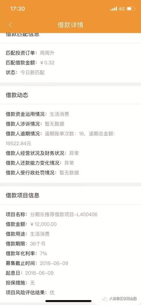 另外有用户反馈一个值得注意的异常,有用户表示桔子理财上面看到有借款人逾期18次,逾期金额将近达2万,居然还能债权匹配给投资人,而且平台给的风控风险居然是优。如下图: