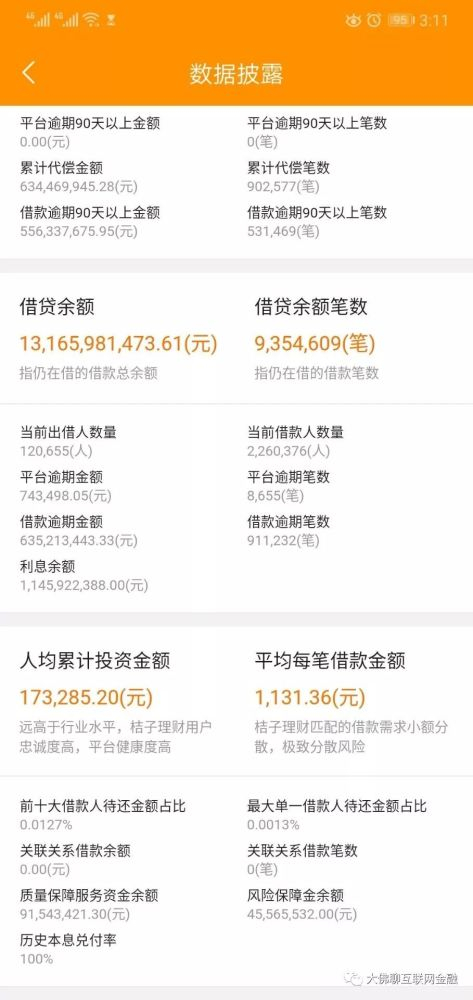 桔子理财背后主要做的是小额信贷产品,主要来源于分期乐,根据乐信披露的财报数据,截止2018年底,整个乐信旗下代偿金额324亿,一位83年在江西出生的年轻老板管理这么多资产,个人比较佩服。从桔子理财披露数据显示,人均借款为1131,而且现金贷借款人主要以等额本息还款方式为主,另外财报还披露在2018年为490万活跃用户用户提供了661亿的贷款。消费分期里面,比如手机主要以12个月的期限居多。324亿代偿,人均借款1131,人均待还也按1131算,平均剩余借款期限按一年算,那么意味着约有3000万左右借款用户在平台有贷款未还。如果按这个算,中国有这么多人在平台借网贷吗?中国每年毕业的大学生一般也就在700万左右,3000万的人口数量,几乎要覆盖掉四个年级大学生的数量。这个反推回的数据又和平台财报发布的2018年活跃贷款用户为490万有较大差距,这是容易引起深思的地方。