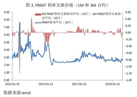 我们用1M FR007利率互换价格同3M FR007利率互换价格进行比较,以此来粗略估计市场(远期)利率预期。当3M FR007利率互换价格持续低于1M合约(且明显低于当前FR007价格)时,反映市场预期未来3个月内FR007下降概率更高,此时资产端的的操作应该是“买长卖短”,负债端则应采取相反操作,从而更加利好shibor 3M利率的下行。