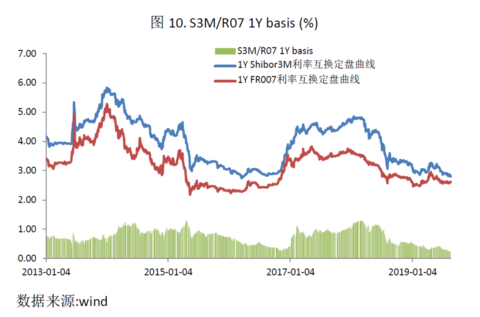 若曲线是在利率下行过程中修复(FR007更快下行),修复的时间关键在于OMO利率调整的时间(或央行重新向市场注入流动性的时间),曲线的修复幅度则涉及到Shibor 3M和FR007的合理利差的重新确定。2019年Shibor 3M和FR007平均利差19BP,远低于2013年以来的平均水平(2013年-2018年平均为82BP),而利率互换合约S3M/R07 1Y basis也降到近年的最低水平(同样为19BP)。