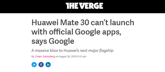 这意味着华为Mate30系列和即将到来的设备,比如华为Mate X,都将受到严重影响。它们仍将运行安卓系统,这是其核心开放源码软件,可以免费获得。但谷歌已经证实华为Mate 30和Mate 30 Pro(据传将于9月18日发布)将无法搭载谷歌的应用和服务,考虑到谷歌应用程序的重要性,这可能会让华为Mate30系列处于严重的劣势。
