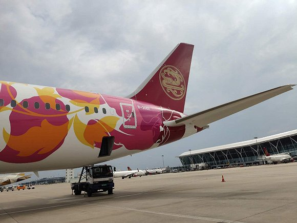 值得一提的是,这架波音787梦想客机在机身设计上采用了由中国本土青年设计师陆然设计的“绚彩花瓣”彩绘涂装。该涂装设计延续中国传统文化元素,以牡丹国花为灵感,配以灵动轻盈的花瓣飘动形象,寓意“花开在眼前”。
